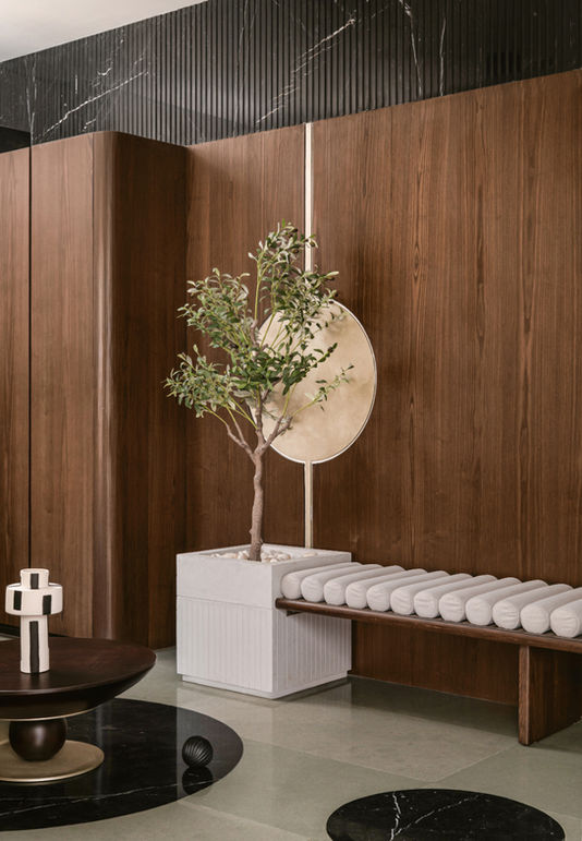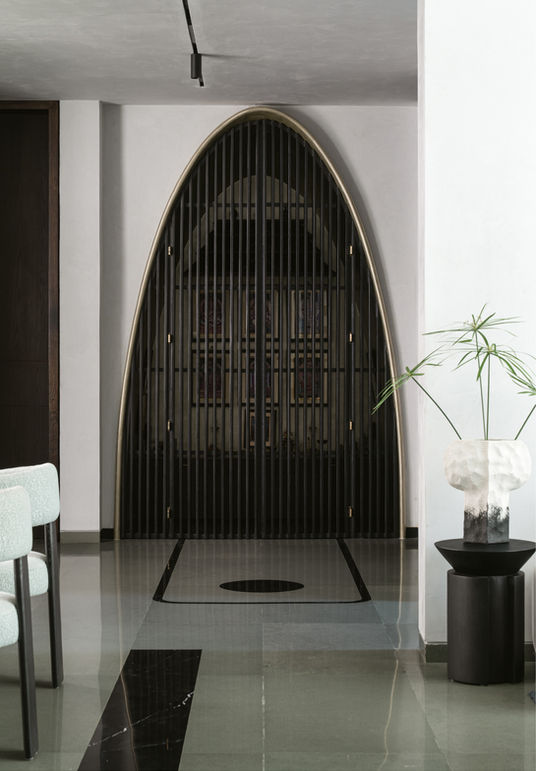 The entrance is the first inhale. Sage-hued Kota stone and inky black Marquina inlay anchor the moment. The palette is hushed, but deliberate. Walls slip between tactile concrete and wood, warm to the eye, cool to the touch. A sculptural wall piece flutters – movement caught in a whisper – its shimmer echoing the soundtrack of light as it brushes across surfaces. Geometry bends gently here: the curve of a sofa, the softness of pill-shaped cushions, the cosmic suggestion of something beyond the tangible.