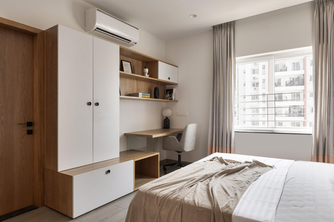 In the master bedroom, soft peach tones evoke a sense of tranquility, while tropical wallpaper adds a hint of summer. A geometric, unconventional Pooja room cabinet—a fusion of yellow perforated metal, wood louvers, and white shutters—strikes a unique balance between the living room and the bedroom.