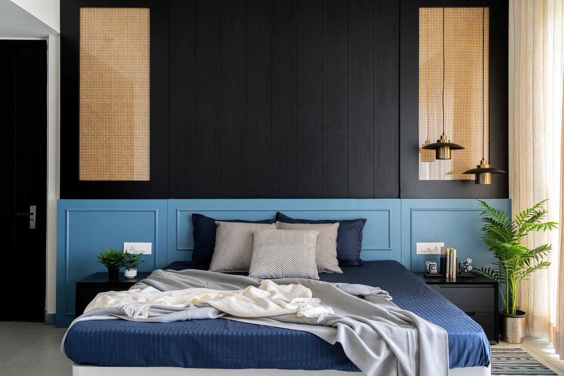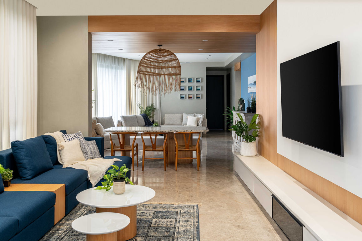 The bedrooms feature graceful cane accents—headboards, wardrobes, and touches that enhance the space’s warmth and texture. Upholstered seating in grey and dark blues complements the surrounding tones, while the AV room, designed with wood, whites, and blues, offers a sanctuary for relaxation. Plants in every corner breathe life into the space, reinforcing the connection to nature.
